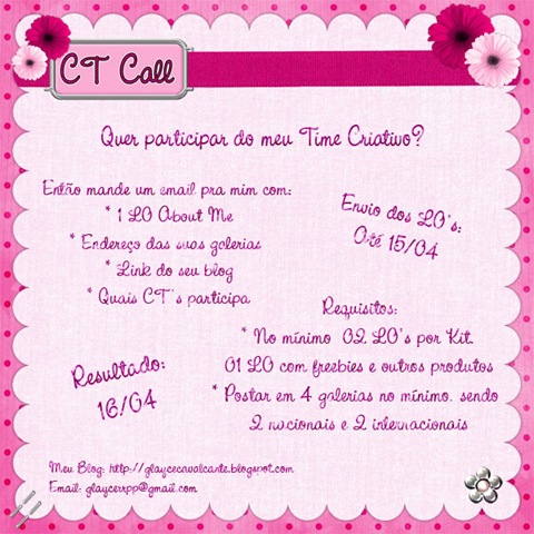 Pena naum poder participar do seu CT Call, pois naum posto em galeria nehuma rsrsrs, ams boa sorte to torcendo muitão por Você!!!